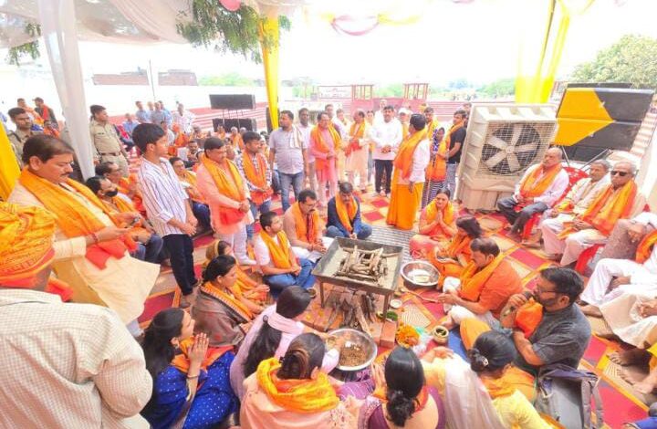 उन्नाव। नवाबगंज बाईपास चैत्रवर मेला प्रांगण स्थित पक्का तालाब एवं परशुराम परिसर में स्थित शिव जी एवं हनुमान जी मन्दिर जीर्णोद्धार व प्राण प्रतिष्ठा कार्यक्रम पक्का तालाब सौंदर्यकरण संपूर्ण कराया गया मंदिर के जीर्णोद्धार एवं सौंदर्यकरण के शुभ अवसर पर जिलाध्यक्ष अनुराग अवस्थी अध्यक्ष, सदर विधायक पंकज गुप्ता नगर पंचायत नवाबगंज दिलीप लश्करी, भाजपा मंडल अध्यक्ष, नवाबगंज शशिकांत राजपूत विमल द्विवेदी, आवास विकास बी ब्लॉक सभासद अशोक कुमार सिंह “मुन्ना, व्यापार मण्डल अध्यक्ष अमित मिश्रा, डॉ अविनाश सिंह चौहान, मियागंज ब्लाक प्रमुख धर्मेंद्र सिंह, बिछिया ब्लॉक प्रमुख नीरज गुप्ता, प्रधान अभिनेंद्र प्रताप सिंह, प्रधान मनोज पांडे, प्रधान पवन शर्मा सहित अन्य कई लोग मौजूद रहे।