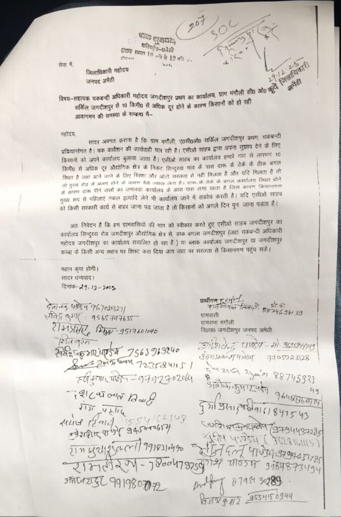 किसानों ने इस गंभीर समस्या को लेकर जिलाधिकारी अमेठी को ज्ञापन सौंपते हुए स्पष्ट रूप से मांग की है कि सहायक चकबंदी अधिकारी महोदय, जगदीशपुर प्रथम का कार्यालय सिंदुरवा रोड स्थित औद्योगिक क्षेत्र से हटाकर डाक बंगला जगदीशपुर, ब्लॉक कार्यालय जगदीशपुर अथवा जगदीशपुर कस्बा के किसी अन्य उपयुक्त एवं सुलभ स्थान पर तत्काल प्रभाव से स्थानांतरित किया जाए, ताकि किसान बिना बाधा अपने कार्यों का निस्तारण करा सकें।