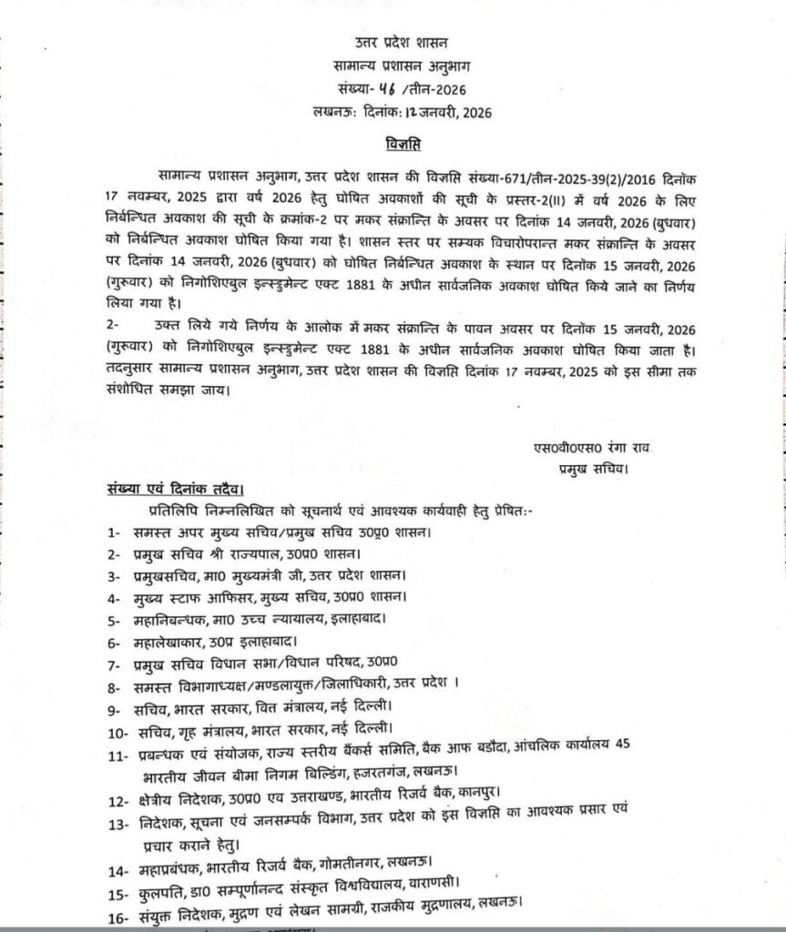 उत्तर प्रदेश शासन के आदेशानुसार मकर संक्रांति का अवकाश दिनांक 14 जनवरी 2026 के स्थान पर अब 15 जनवरी 2026 (गुरुवार) को घोषित किया गया है।