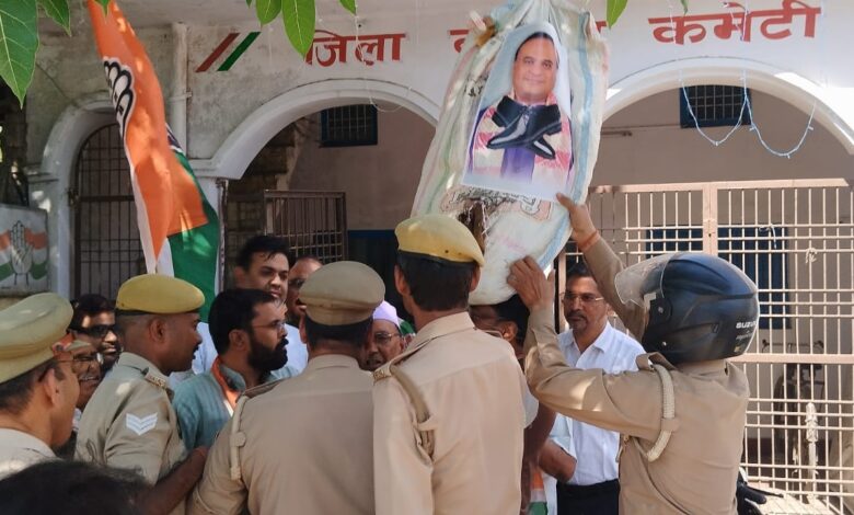 उन्नाव में कांग्रेस का प्रदर्शन रोका गया, पुतला दहन से पहले पुलिस ने छीना पुतला।