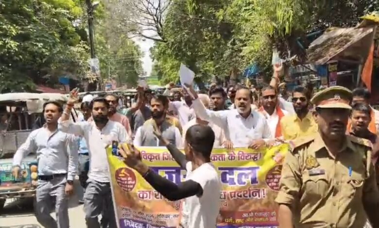उन्नाव में बजरंग दल का विरोध प्रदर्शन, डीएम कार्यालय तक निकाली आक्रोश यात्रा।