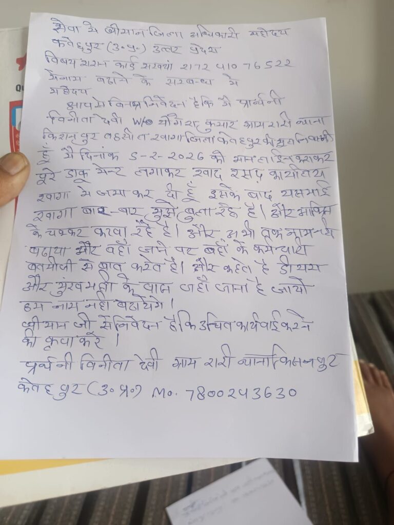 ग्राम रारी निवासी प्रविनी विनिता देवी, पत्नी योगेश ने जिलाधिकारी को दिए गए प्रार्थना पत्र में बताया कि उन्होंने 5 फरवरी 2026 को तहसील आपूर्ति कार्यालय में राशन कार्ड में परिवार के अन्य सदस्यों का नाम जोड़ने के लिए आवेदन किया था। आरोप है कि संबंधित बाबू को प्रार्थना पत्र देने के बावजूद अब तक कोई कार्रवाई नहीं हुई।